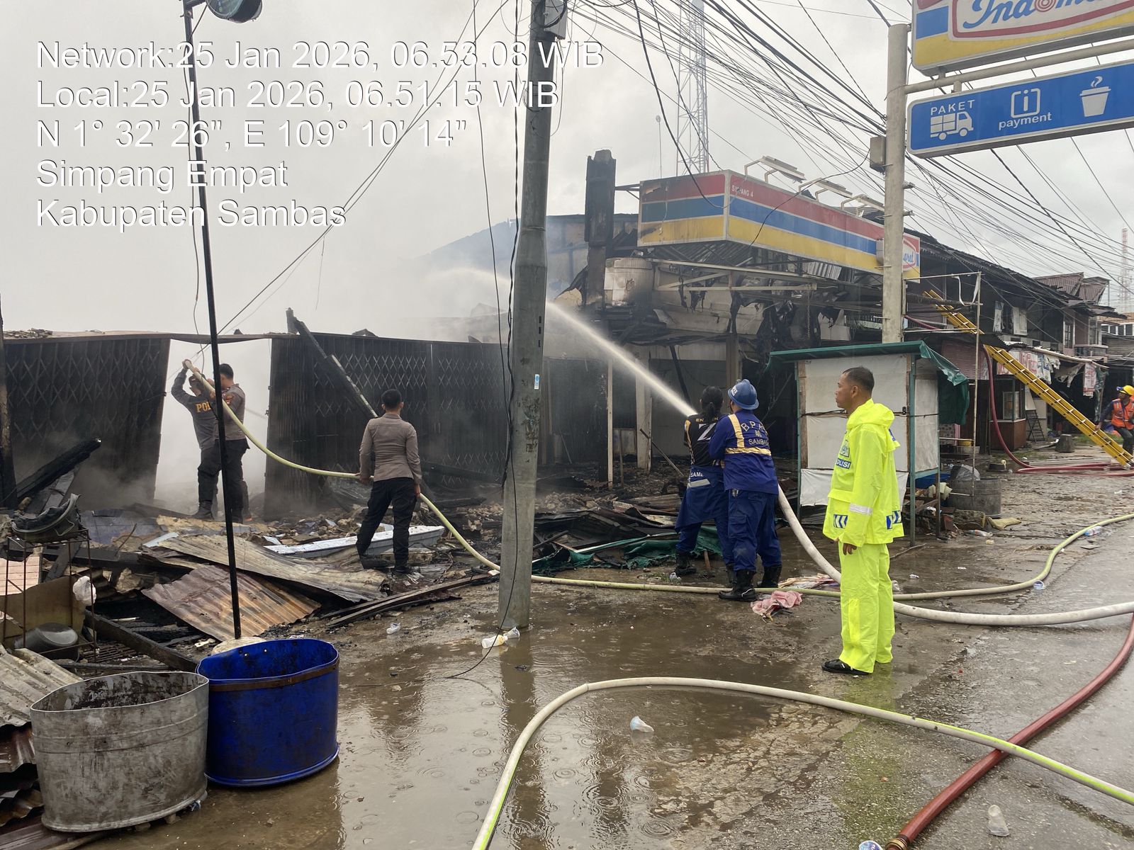 Sambas, Metrojayanews.com- Polres Sambas dan Polsek Teluk Keramat menerima adanya laporan kebakaran yang melanda 10 unit ruko dan 1 unit rumah di Dusun Simpang Empat, Desa Simpang Empat, Kecamatan Tangaran, Kabupaten Sambas, Provinsi Kalimantan Barat, pada Minggu (25/1/2025) sekira pukul 03.30 WIB.