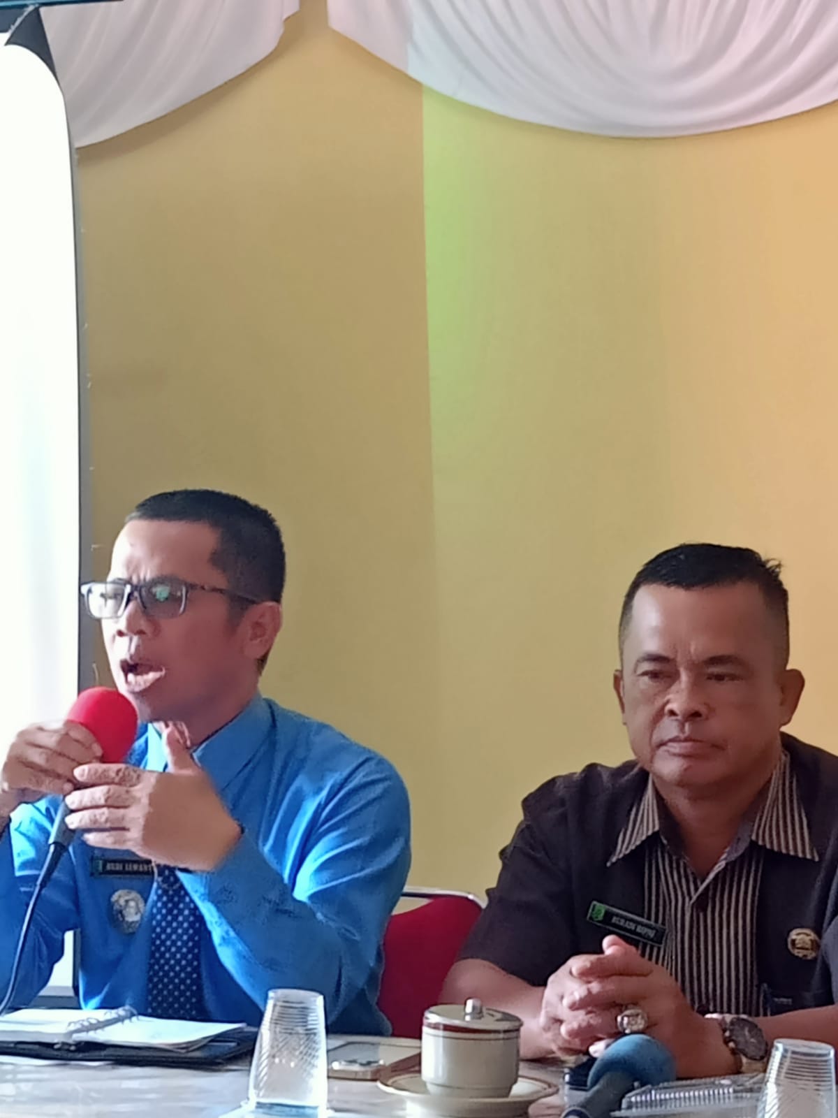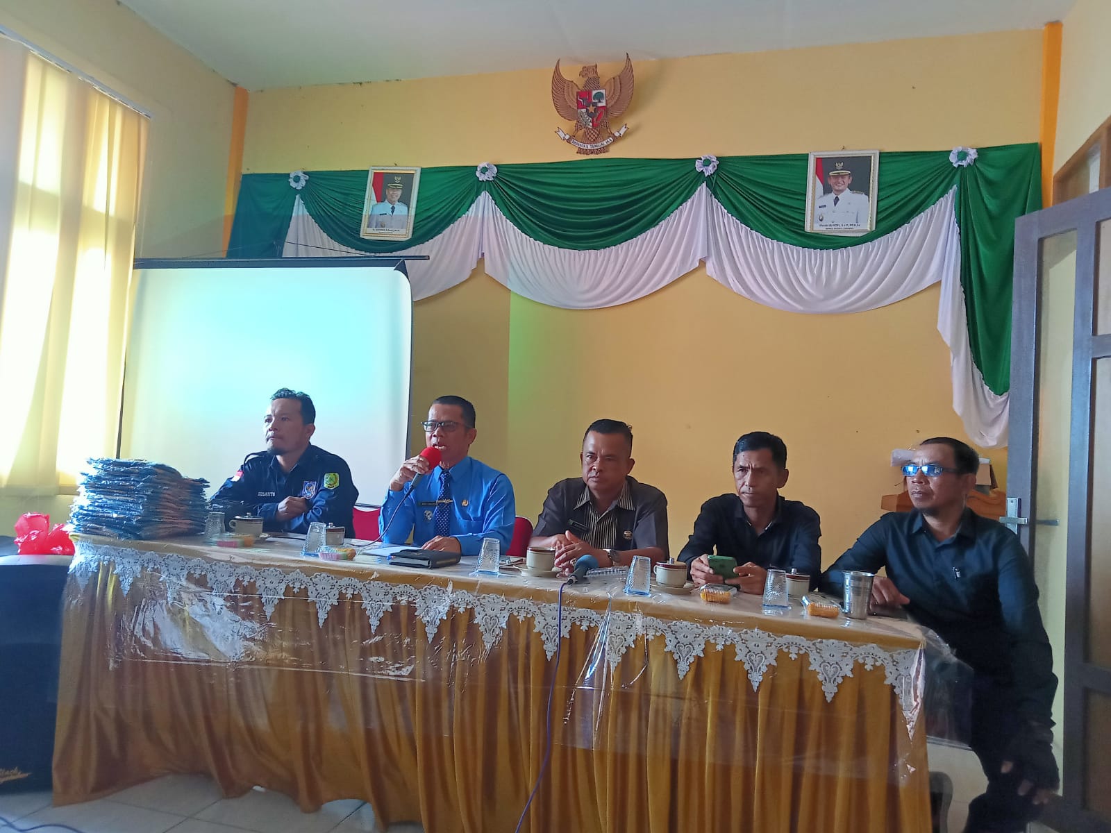 Camat Teluk Keramat Dr.Budi Iswanto,S.Pd.I. MM ( baju biru ) yang didampingi Sekretaris Camat Buradi,S.Pd, MPd